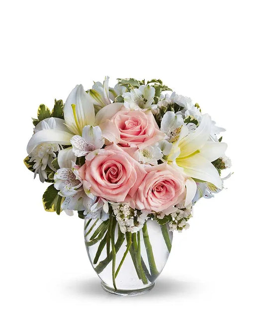 Delicate and full of charm, this bouquet features soft pink roses paired with graceful white alstroemeria, each bloom accented with subtle blush markings. Arranged in a rich pink glass vase and finished with a satin ribbon, it's a sweet and stylish way to celebrate birthdays, anniversaries, or just to show...
