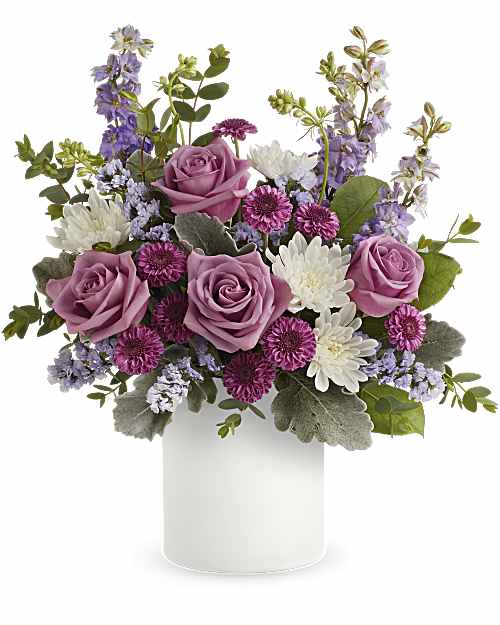 This lushful bouquet full of purple florals will delight your loved one for days. Perfect gift to celebrate a special day, a birthday or just because. Includes:⒠Crème Roses⒠Lavender Alstroemeria⒠Purple Stock⒠Purple Button Chrysanthemums⒠Lavender Cushion Spray Chrysanthemums⒠White Limonium⒠Bupleurum⒠Huckleberry⒠Cylinder Vase