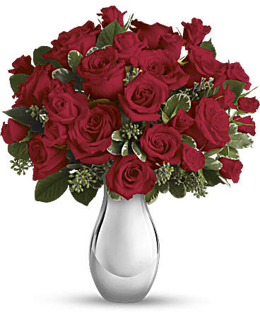 Give your special someone visions of love with this luxurious gift of bright white lilies and romantic red roses, presented in a radiant red vase. This beloved bouquet includes red roses, white asiatic lilies, red carnations, red miniature carnations, white cushion spray roses, white sinuata statice, dusty miller, huckleberry, and...