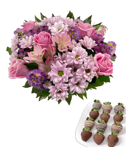 Treat someone special to a gift that's as sweet as it is beautiful. This charming bundle features a soft and elegant bouquet of pink roses, lavender cushion poms, pink and purple alstroemeria, and purple asters, all arranged in a clear glass vase for a timeless presentation. Paired with a decadent...