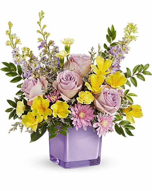 Bring a soft touch of spring indoors with the Pastel Paradise Bouquet. Lavender roses and golden blooms shine in a radiant glass cube, creating a fresh, joyful display of color and beauty. This bouquet features lavender roses, yellow alstroemeria, yellow miniature carnations, lavender larkspur, lavender cushion spray chrysanthemums, and white...