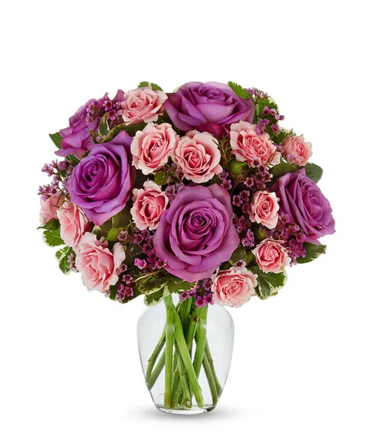 An arrangement of gorgeous hues of violet, perfect for any person and for any special occasion. Its perfect purples and pretty pinks pop against floral greens. This bouquet is the perfect classic-meets-modern floral arrangement that they will absolutely adore.